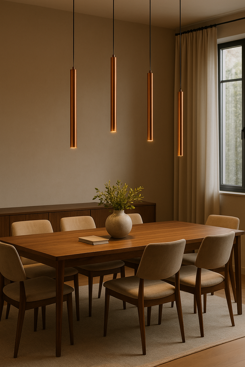 Cette suspension élancée au design cylindrique incarne la pureté et la modernité. Sa silhouette discrète s’intègre parfaitement dans tout type d’intérieur, du plus épuré au plus sophistiqué.